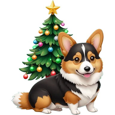black tricolor corgi with no tail and christmas tree next to it emoji