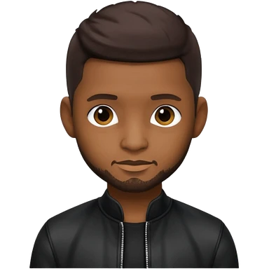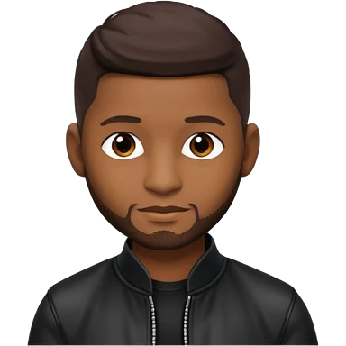 Usher with dark brown hair, vinyl black outfit emoji