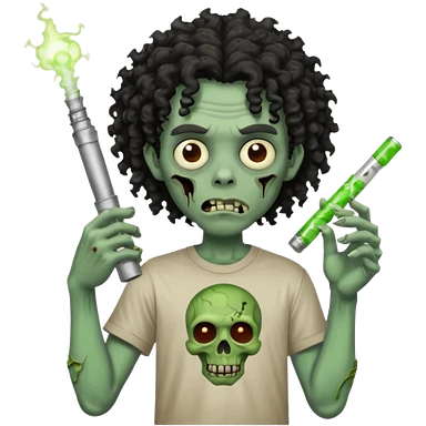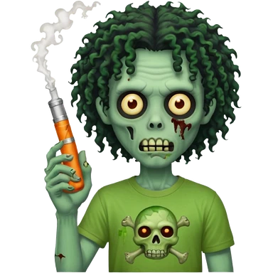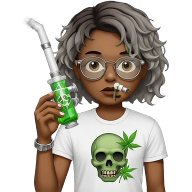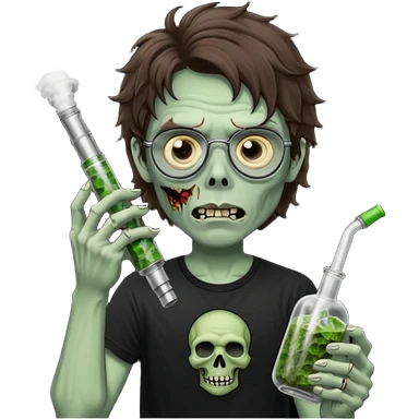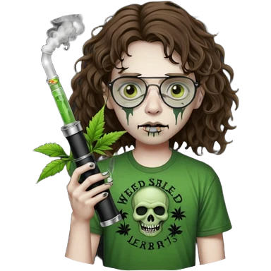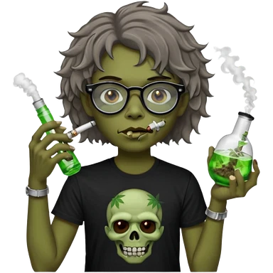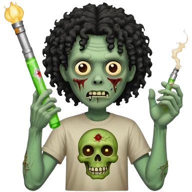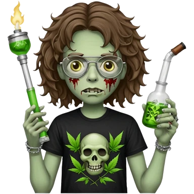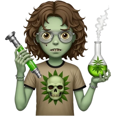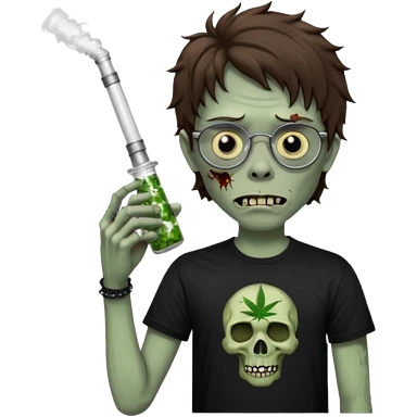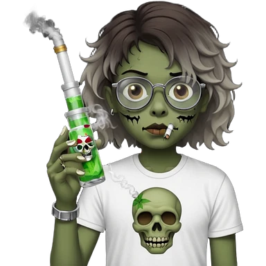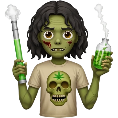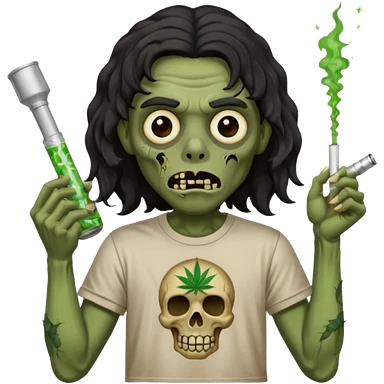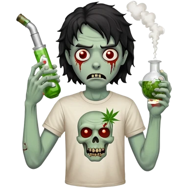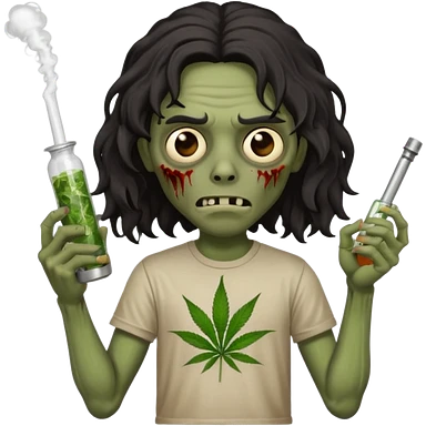 black wavy haired zombie getting stoned with weed t shirt and bong on his hand emoji | AI Emoji Generator