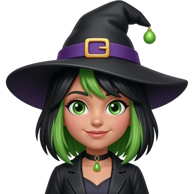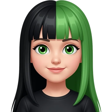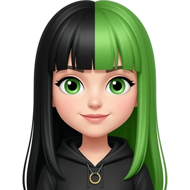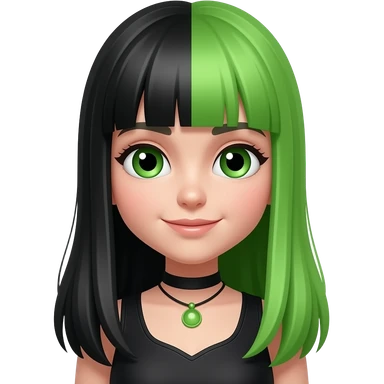 Mirabelle, a witch girl with black and green split straight hair, emoji