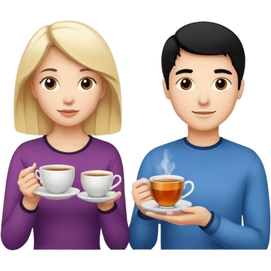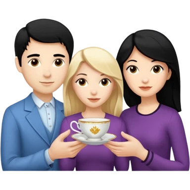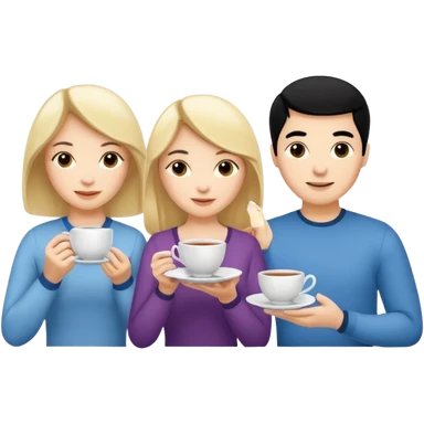 One blond white woman, one black hair white woman and one dark blond white man with tea cups emoji