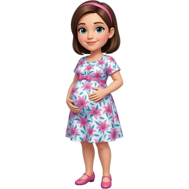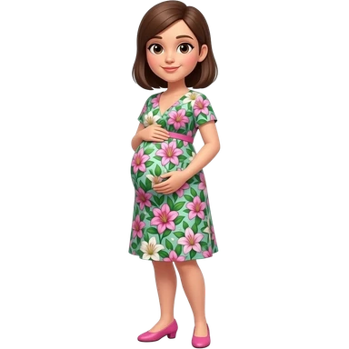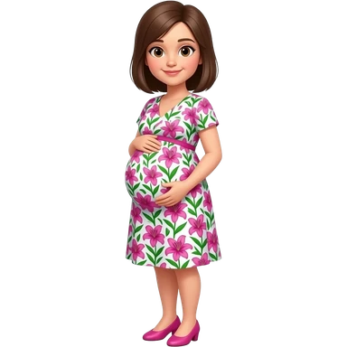 Short pregnant women. Wearing a pink and blue and white lily politzer dress and pink shoes. She has brown semi straight hair in a side part emoji