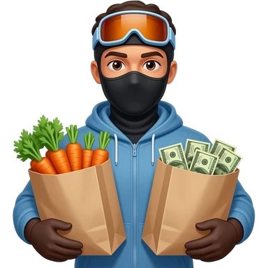 Tan black young man holding grocery bags full of carrots and money wearing a black ski mask emoji