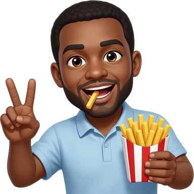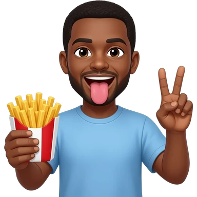 Black man holding french fries throwing up peace sign🧑🏾🦱 emoji