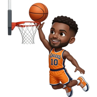 black man with fluffy brown low taper fade dunking the ball in jersey number 10 and the colors of of the jersey is orange and black emoji