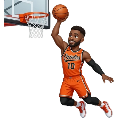 black man with fluffy brown low taper fade dunking the ball in jersey number 10 and the colors of of the jersey is orange and black and the jersey said “orioles” emoji