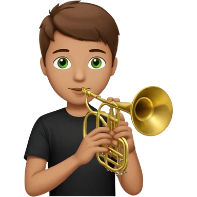 young man with brown hair that goes up, green eyes who plays a trumpet, black t shirt emoji