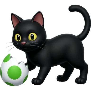 solid black cat playing with a yoshi egg from the super mario franchise, the egg is cracked open with a little yoshi popping out emoji
