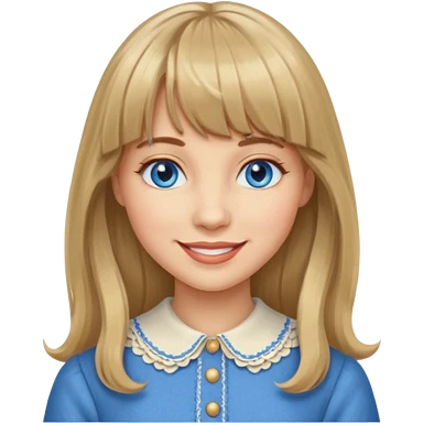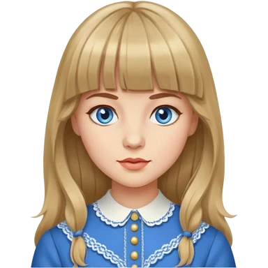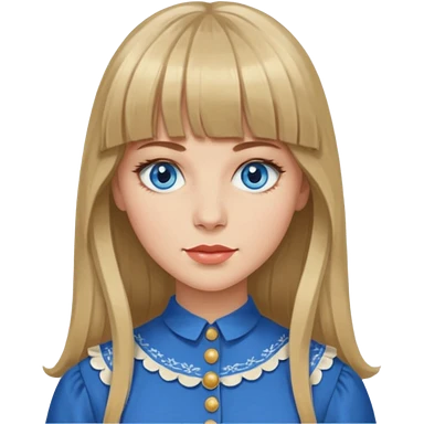 Woman with long dark blond hair and bang, blue eyes, vintage clothe emoji emoji