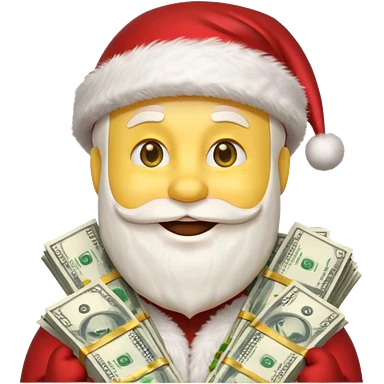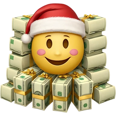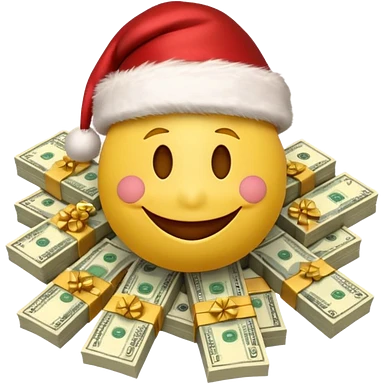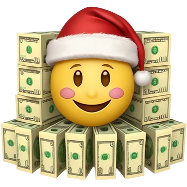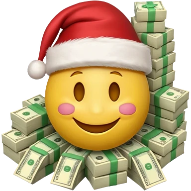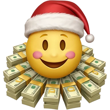 A festive 3D emoji style yellow smiley face wearing a Santa hat, surrounded by stacks of cash and dollar bills, joyful expression, Christmas and New Year theme, high quality, clean design, studio lighting, no text, no background, isolated object, transparent background, emojis.com style emoji