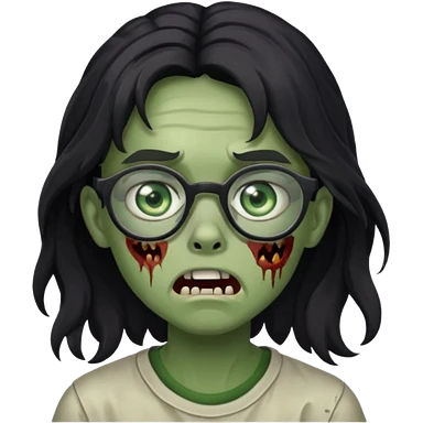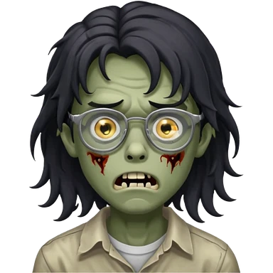 Faça um adolescente zombie com cara de assutado com cortes no rosto, com óculos é cabelos grandes ondulado preto emoji