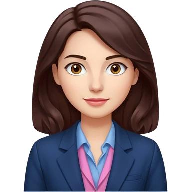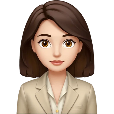 Roupas de CEO empresária Tom de pele: clara com fundo rosado Cabelos: longos, castanho escuro, levemente ondulados Sobrancelhas: bem definidas e cheias Olhos: castanhos claros (podem ser destacados com brilho) Traços marcantes: lábios cheios e sorriso suave emoji