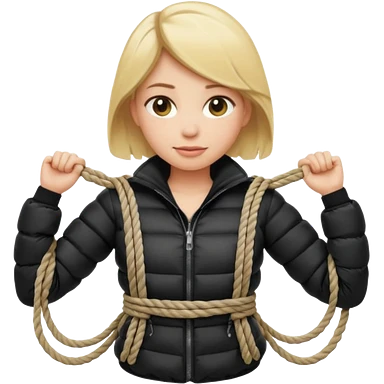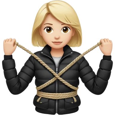 blond female emoji wearing a black down jacket, arms behind the back and ropes tying it emoji