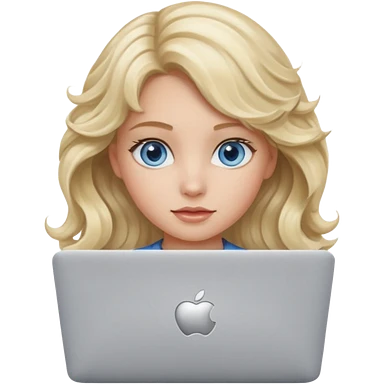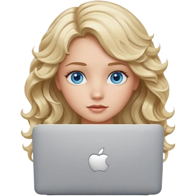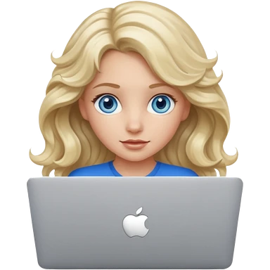 blond girl, blue eyes, hair wavy, , behind her silver colored laptop from apple emoji