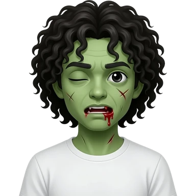 low quality, dark green skin zombie, black long curly 3c type hair, mouth slightly open with blood leaking out of mouth, wounds and on zombie, white regular tee shirt, a young teenager, no wrinkles on face at all, eyes blacked out all the way with one eye shut, bloody cuts, one eye shut emoji