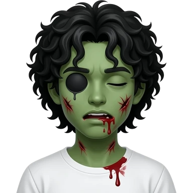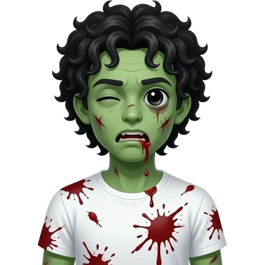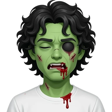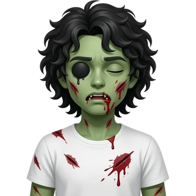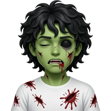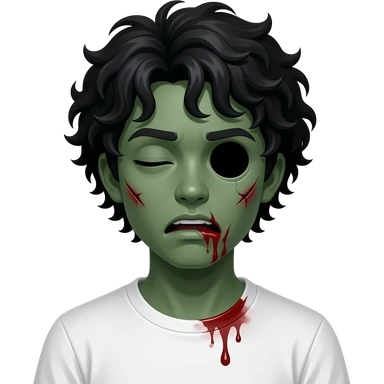 dark green skin zombie, black long curly 3c type hair hanging over forehead , mouth slightly open with blood leaking out of mouth, wounds and on zombie, white regular tee shirt, a young teenager, no wrinkles on face at all, eyes blacked out all the way with one eye shut, bloody cuts, one eye shut emoji