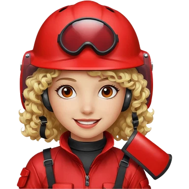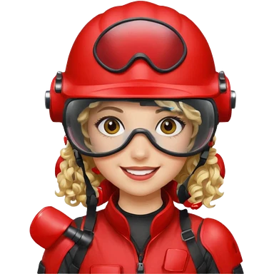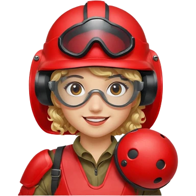 blond curly girl playing paintball with red paintball helmet with eye protection, only face emoji