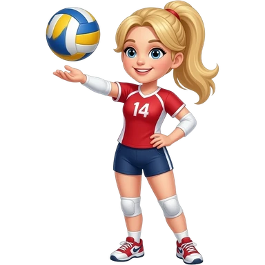 blonde girl with blue eyes in a volleyball uniform holding a volleyball emoji
