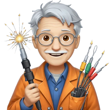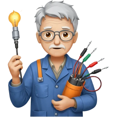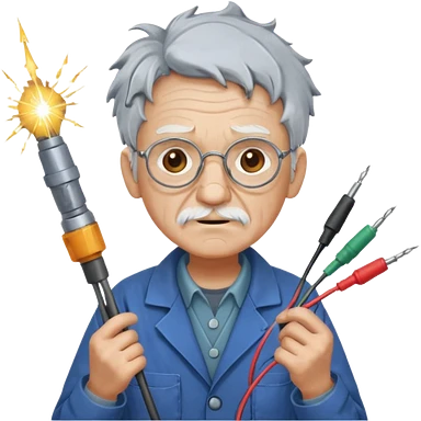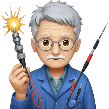 A scatteredbrained old tinkerer with messy workshop coat, holding sparking wires. emoji