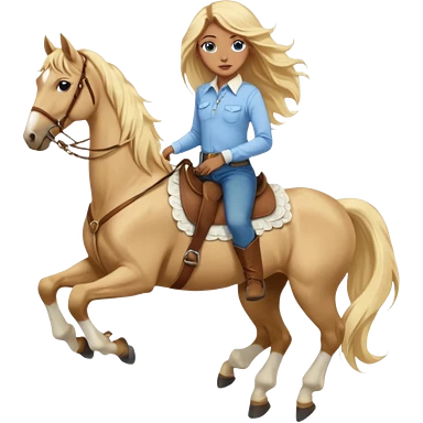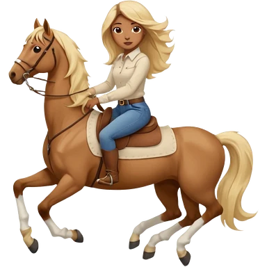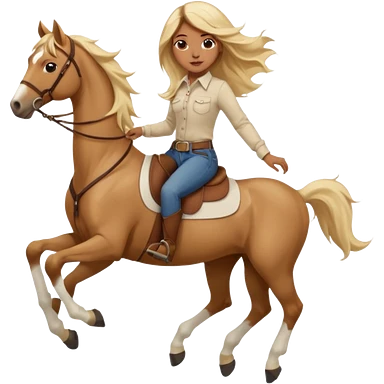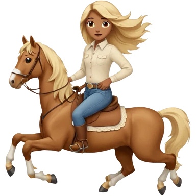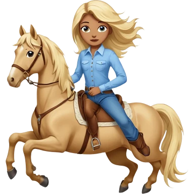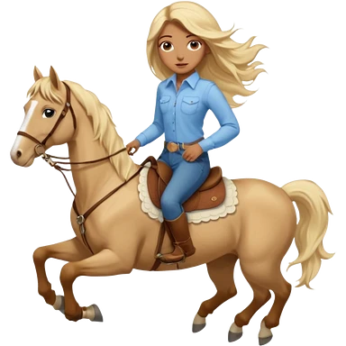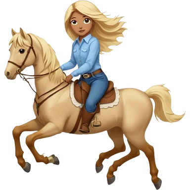 Brown girl with blue eyes and very, very long blonde/gold hair that’s blowing in the wind wearing a cream colored collared long sleeve shirt and jeans with brown boots on top of a brown horse, don’t show it’s legs emoji