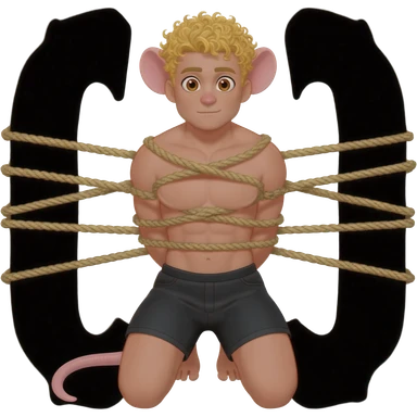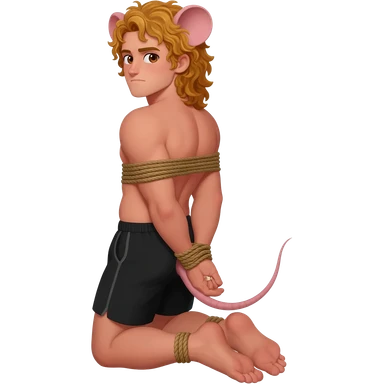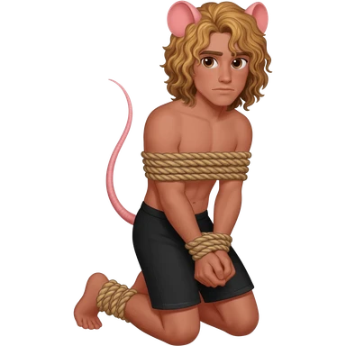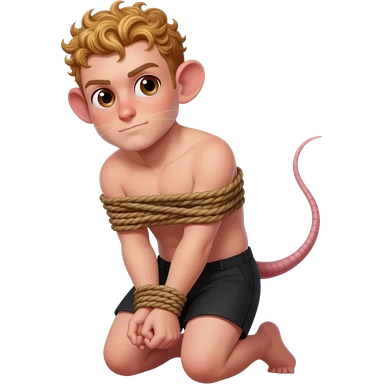 man with brown eyes, rat ears, curly blond hair. he has rat tail. he dressed in black shorts. he is on his knees. her arms are tied up with ropes emoji