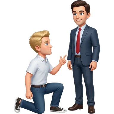 Blonde man kneeling in front of a dark haired white man Standing in front of him. emoji
