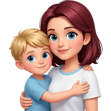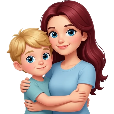Blonde 8 year old boy hugging mom mom has dark red black hair and mom has home clothes and boy has home clothes mom with long dark red black hair emoji