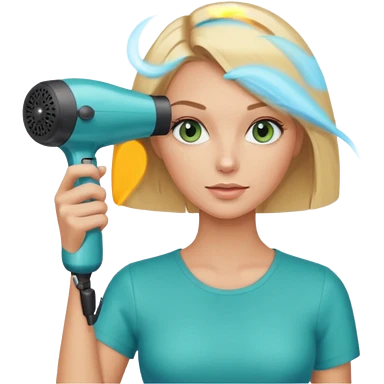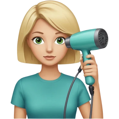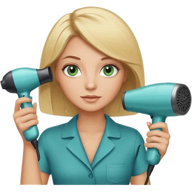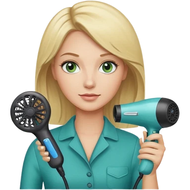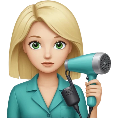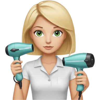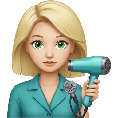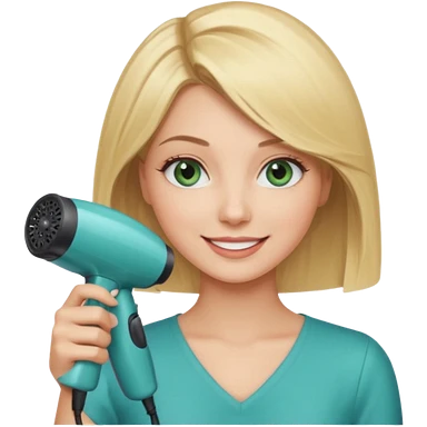 Blonde bob girl hair stylist with blue green eyes holding a hair dryer emoji