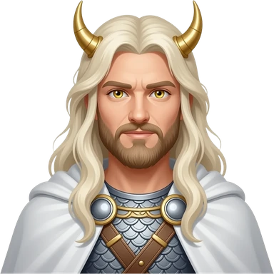 Baldr from Norse Mythology with gold eyes, long white blonde warrior mane hair, silver tunic, white cloak emoji