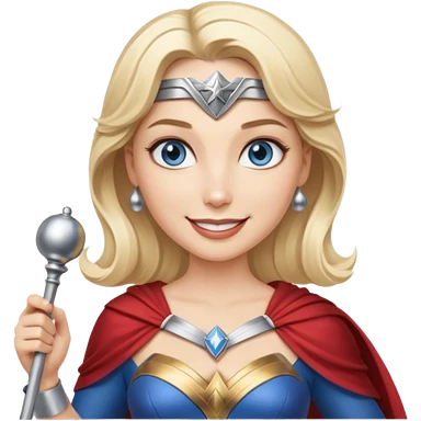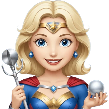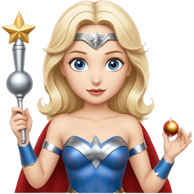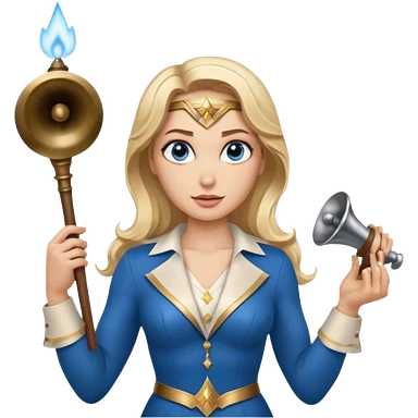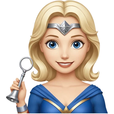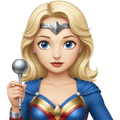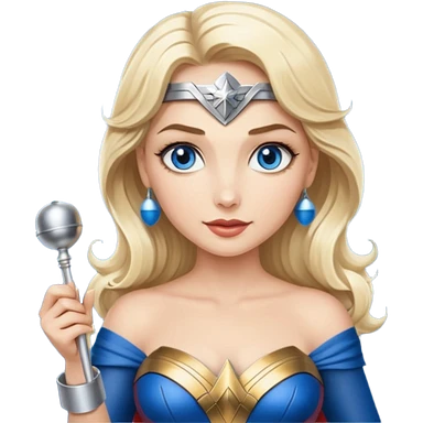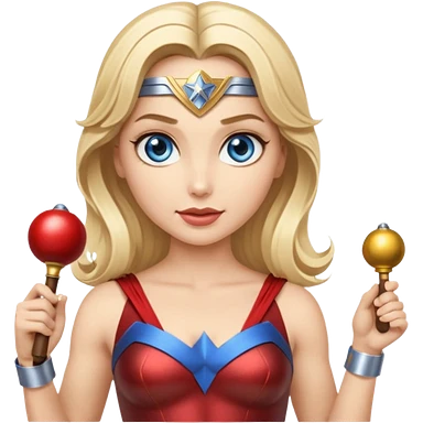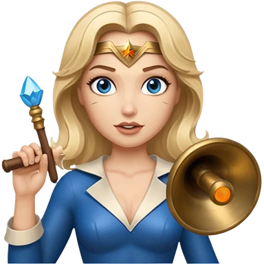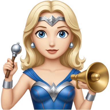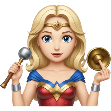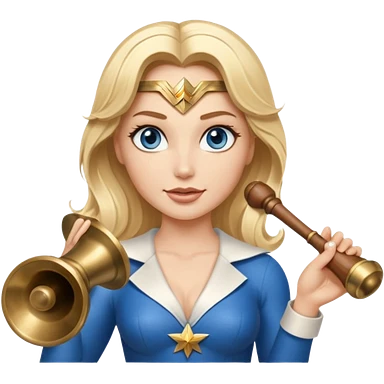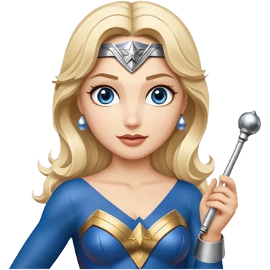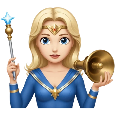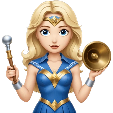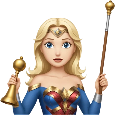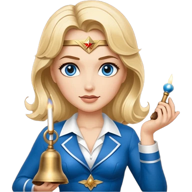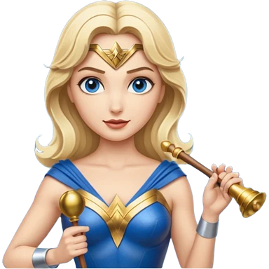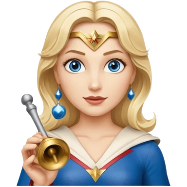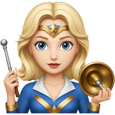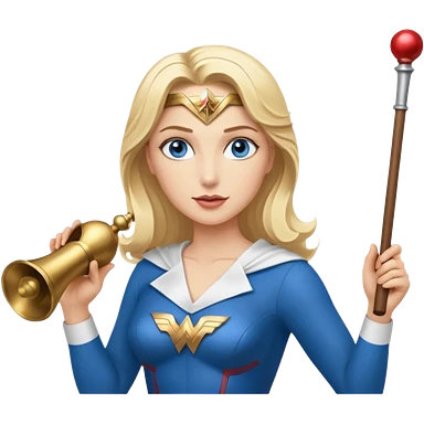 Blonde blue eyes Wonder Woman holding bell and short white orchestra conductor’s baton emoji | AI Emoji Generator