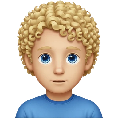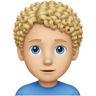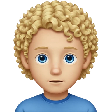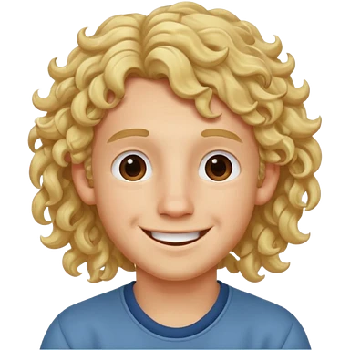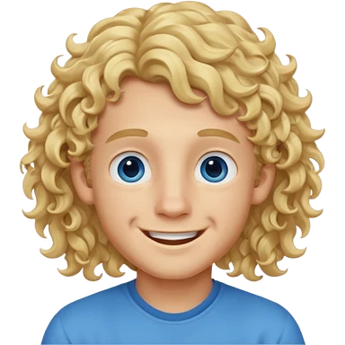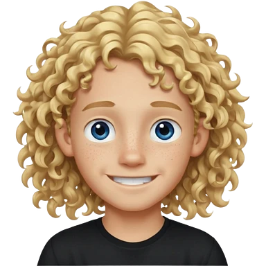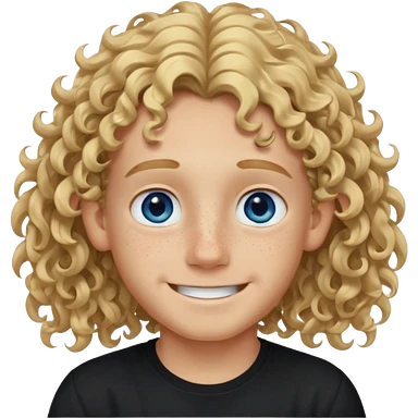 blonde boy with long curly hair past his ears, smiling, wearing a black shirt with freckles and blue eyes emoji