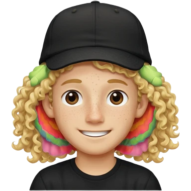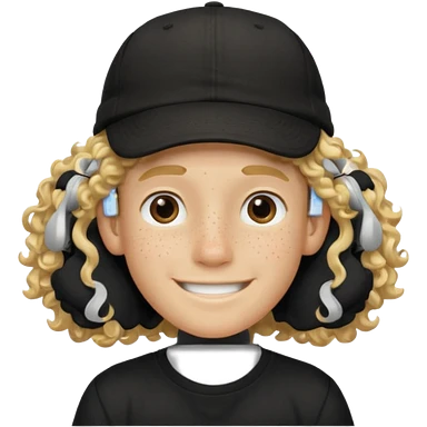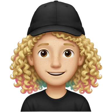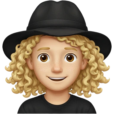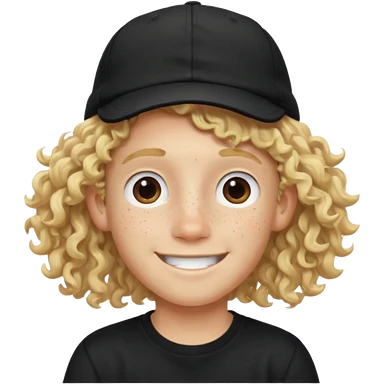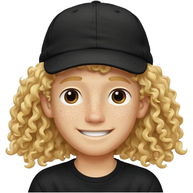 blonde boy with long curly hair past his hears and a LA hat, smiling, wearing a black shirt with freckles emoji
