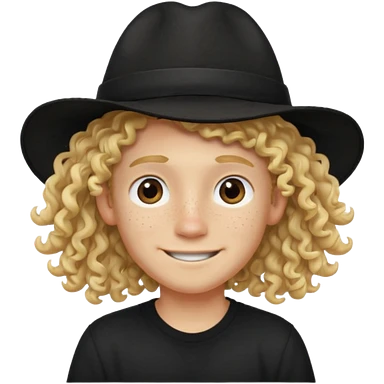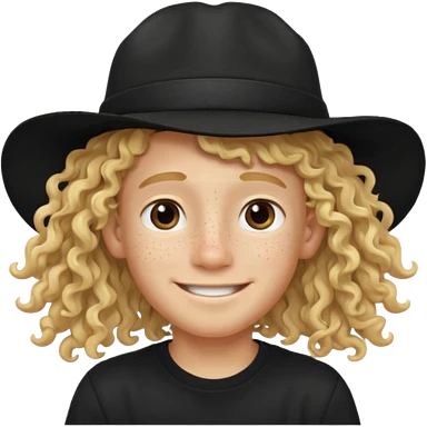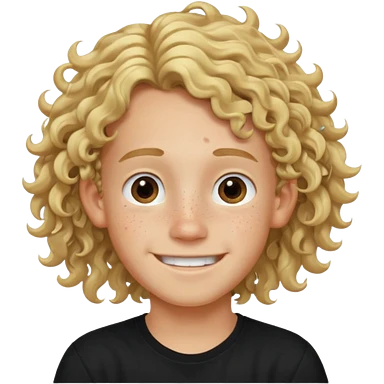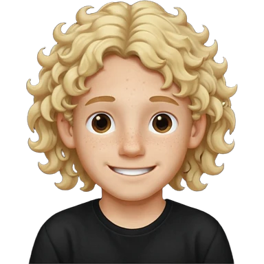 blonde boy with long curly hair past his ears, smiling, wearing a black shirt with freckles emoji