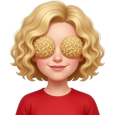 blonde curly bob covering both eyes in red shirt emoji