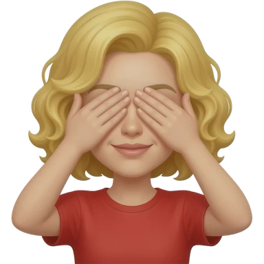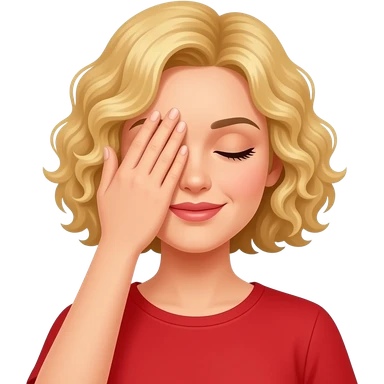 blonde curly bob covering both eyes with hands in red shirt emoji