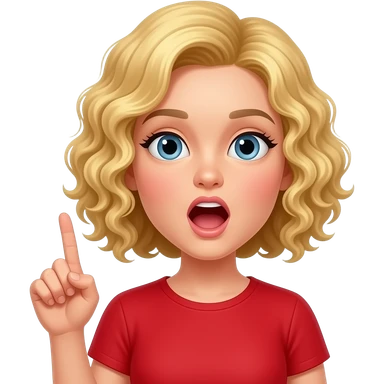blonde curly bob with mouth saying in an o with finger in the air in a red shirt emoji