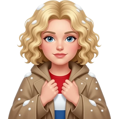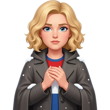 blonde curly bob cold face with hands sheltering body in a cape coat and snow around in red, white and blue shirt emoji