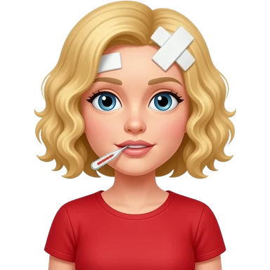blonde tight curly bob with a bandage on head and thermometer in mouth in a red short sleeve shirt emoji