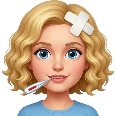 blonde tight curly bob with a bandage on head and thermometer in mouth emoji