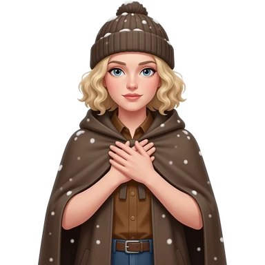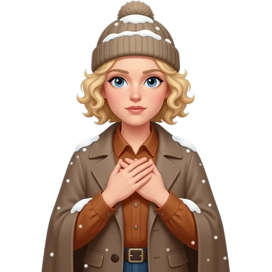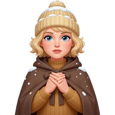 blonde tight curly bob cold face with hands sheltering body in a cape coat and winter hat and snow around in a brown sweater emoji