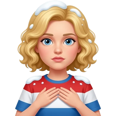blonde curly bob cold face with hands sheltering body and snow around in red, white and blue shirt emoji