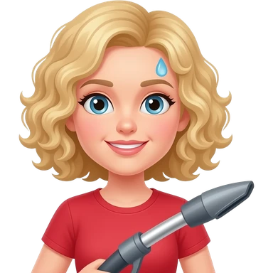 blonde curly bob holding a dust buster with sweat in a red shirt emoji