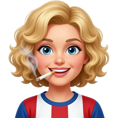 blonde curly bob exhaling face with smoke coming out of mouth smiling eyes in red, white and blue shirt emoji