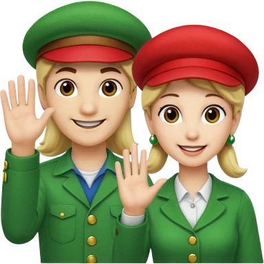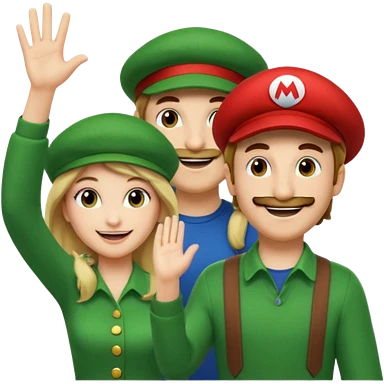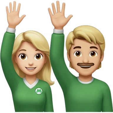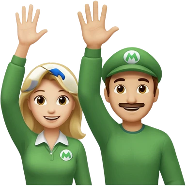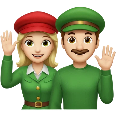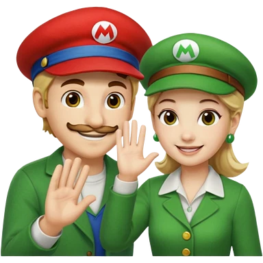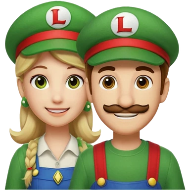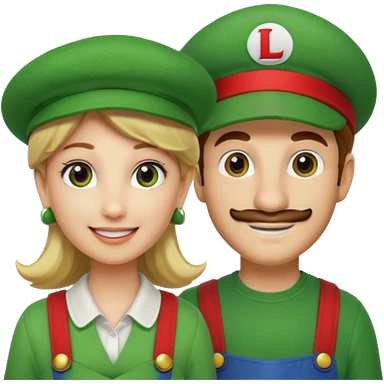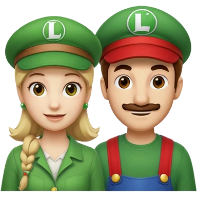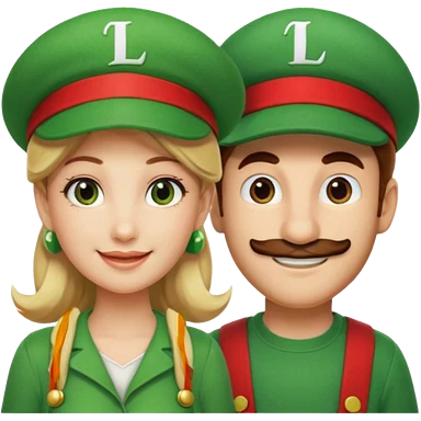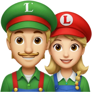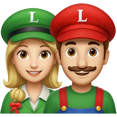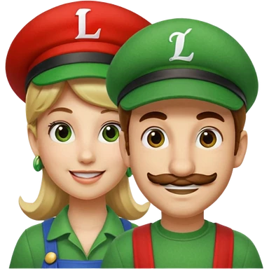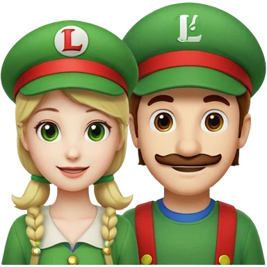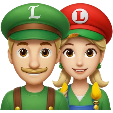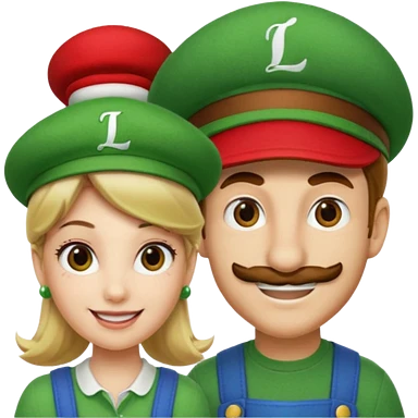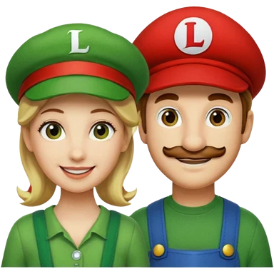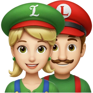 blonde female Luigi (with the Luigi green hat with an L on it) and a normal brown hair male Mario with the red hat with a M on it. They are friends just smiling emoji | AI Emoji Generator