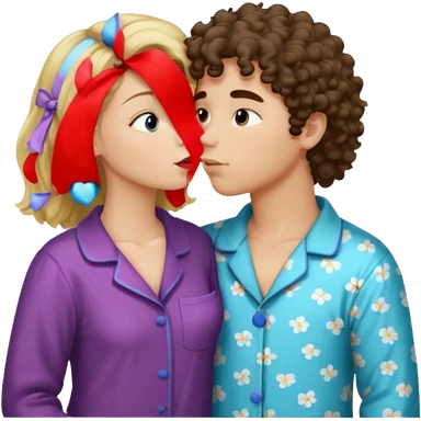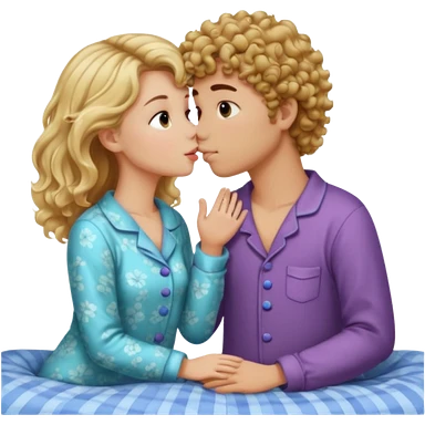 Blonde girl and brown curly haired boy kissing in pajamas emoji | AI Emoji Generator
