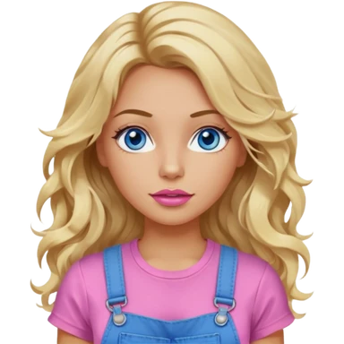 create an emoji of a young woman, very long blonde wavy hair mid-part, blue eyes, tanned skin, a gentle look. she wears a white short sleeve lacy top and an overall emoji