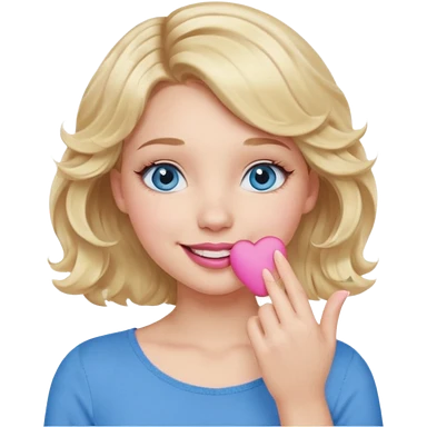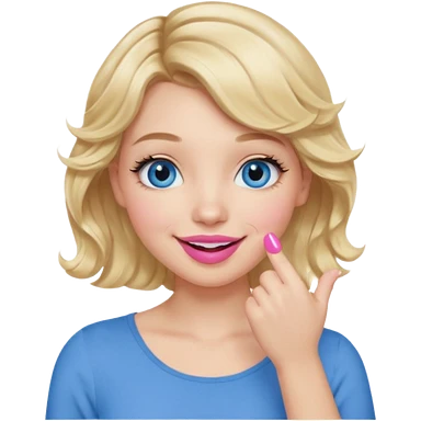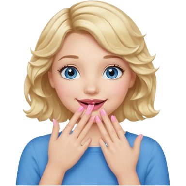 Girl Blonde short wavy hair, blue eyes, cute blue top, long lashes, pink lips, smiling, hand covering the mouth emoji