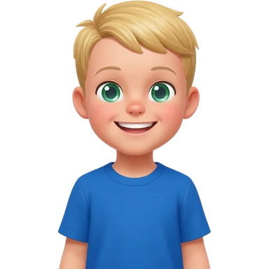 Use the same 3 year old blonde boy with green-blueish eyes as before happy getting dressed, putting on a blue tshirt emoji