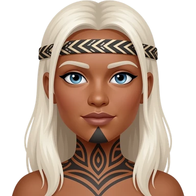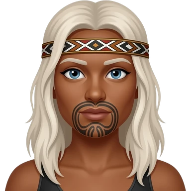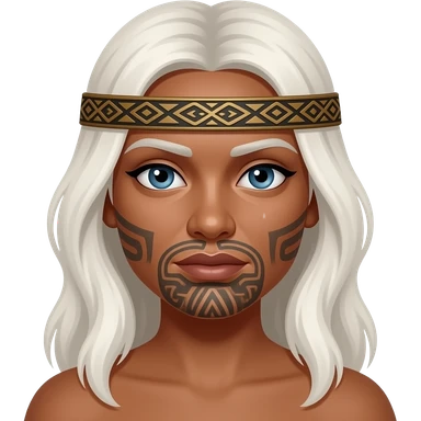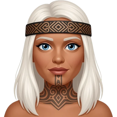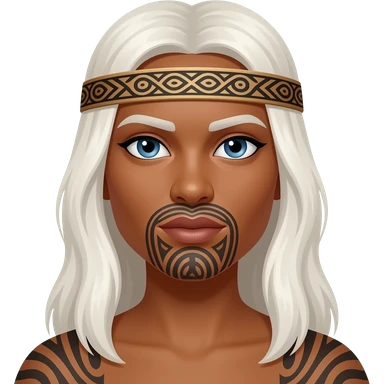 Maori warrior female with tribal moko Kauwae on chin only dark skinned Taniko headband long white blonde hair and blue eyes emoji