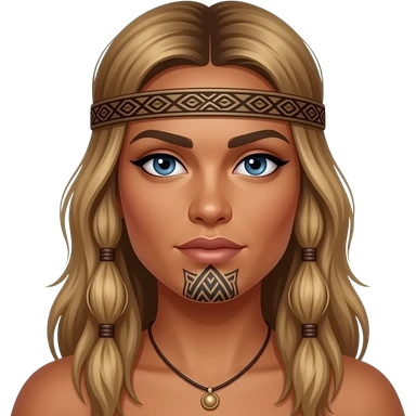 Maori warrior female with moko Kauwae on chin only dark skinned Taniko headband long blonde hair and blue eyes emoji